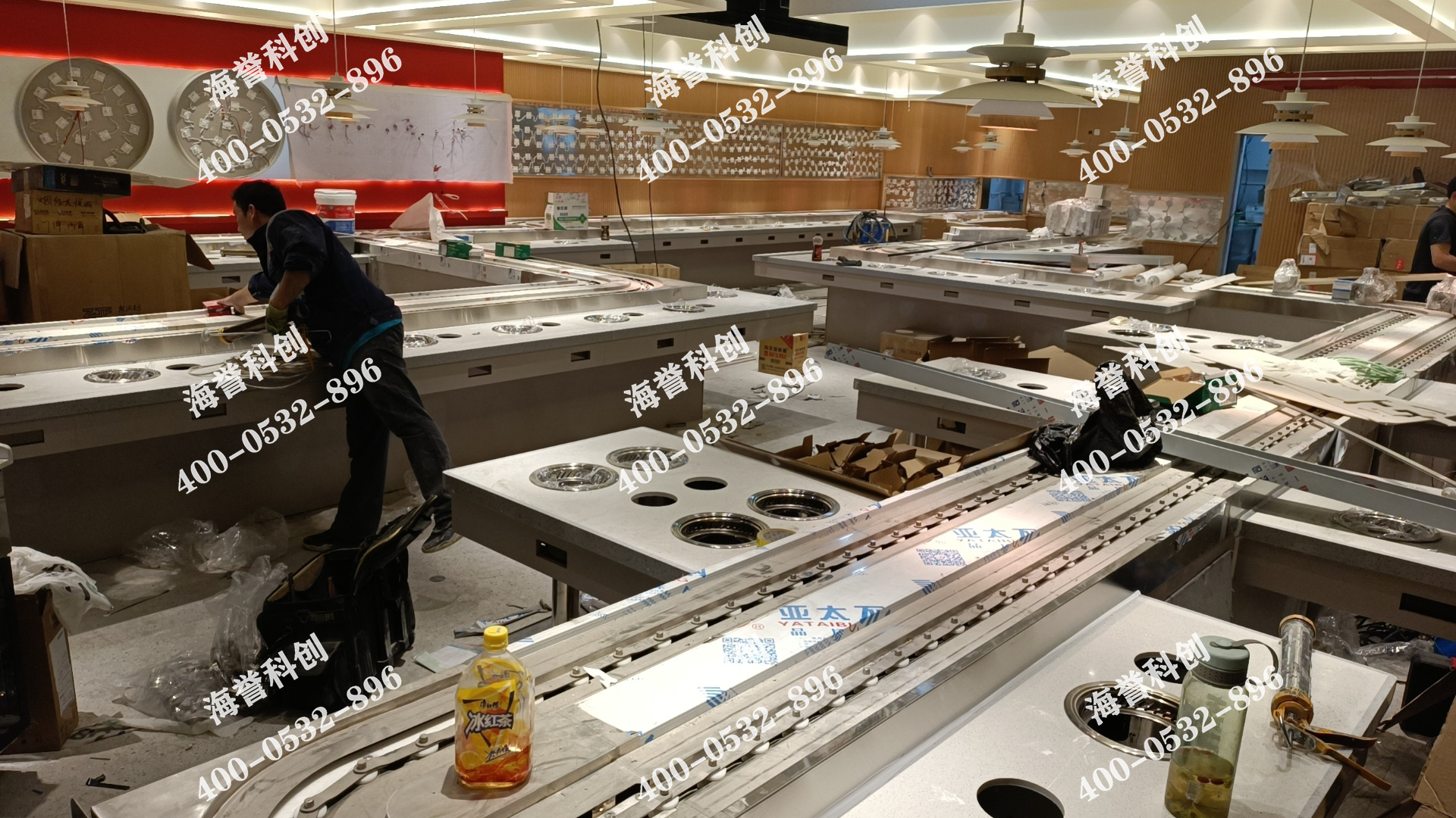 大型店面空間的一次回轉(zhuǎn)線安裝案例,海譽科創(chuàng)可非標(biāo)定制各種異形形狀,以便完美契合店面布局,打造最合適的餐廳動線,幫助提高經(jīng)營效率。單涮小火鍋配置回轉(zhuǎn)線,眾多菜品均由回轉(zhuǎn)線自動傳送,顧客自助拿取,有效節(jié)省人力成本。小湯鍋能讓鍋底快速沸騰,就餐時間短,翻臺率高。單涮小火鍋以單人餐位為主,滿足了想一個人吃火鍋不尷尬的顧客,同時可選擇定制四人桌,小型聚會也能接待。設(shè)備的各個部分所用材質(zhì)、顏色均可根據(jù)店面裝修風(fēng)格進行自由的個性化定制,整套設(shè)備堅固耐用,表面光潔易清理,自帶的排煙罩能帶走火鍋涮制過程中產(chǎn)生的油煙水汽,打造時尚無煙小火鍋餐廳。