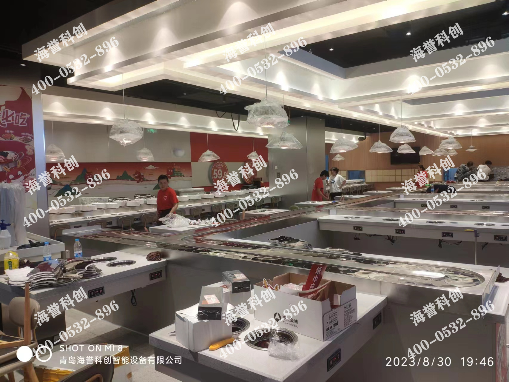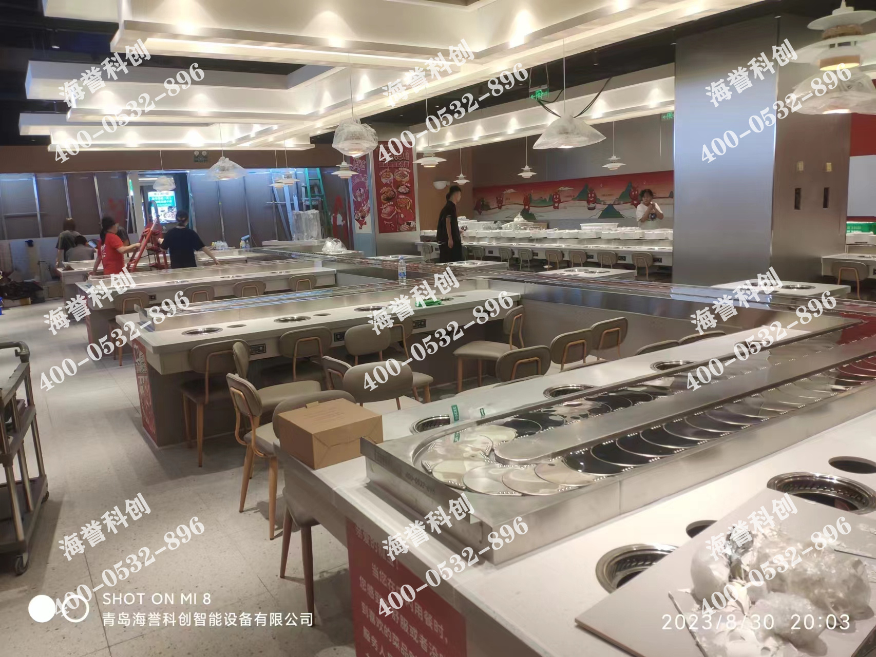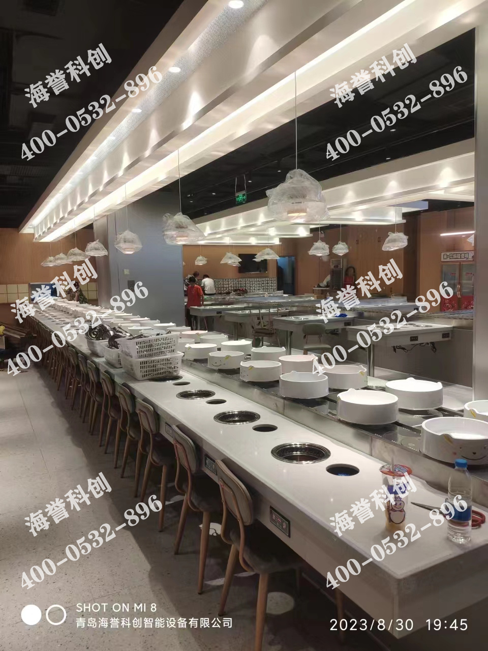 大店安裝示例,設(shè)備線長度較長,由專業(yè)設(shè)計(jì)師根據(jù)店面平面圖和餐廳動線原理進(jìn)行設(shè)計(jì),屬非標(biāo)定制,配置單人餐位與四人餐位,一端連接進(jìn)后廚,后廚人員不必在前廳和后廚之間來回走動上菜,直接在后廚出餐口就能及時補(bǔ)充菜品和上菜,整個上菜過程簡便、安全、高效。本套設(shè)備的軌道葉片采用海譽(yù)科創(chuàng)專利產(chǎn)品四星譽(yù)金鋼,表面如鏡面光滑,葉片之間互相卡合嚴(yán)密,拆卸清洗也無壓力,同時堅(jiān)韌度高,能穩(wěn)穩(wěn)承托較大的餐盤在回轉(zhuǎn)帶上轉(zhuǎn)動。單涮無煙小火鍋是目前做得最多的,尤其在商場大店里,排煙是餐廳就餐環(huán)境的保證,能讓顧客就餐后身上沒有火鍋味殘留,利于旋轉(zhuǎn)小火鍋店的形象口碑,提升競爭力。