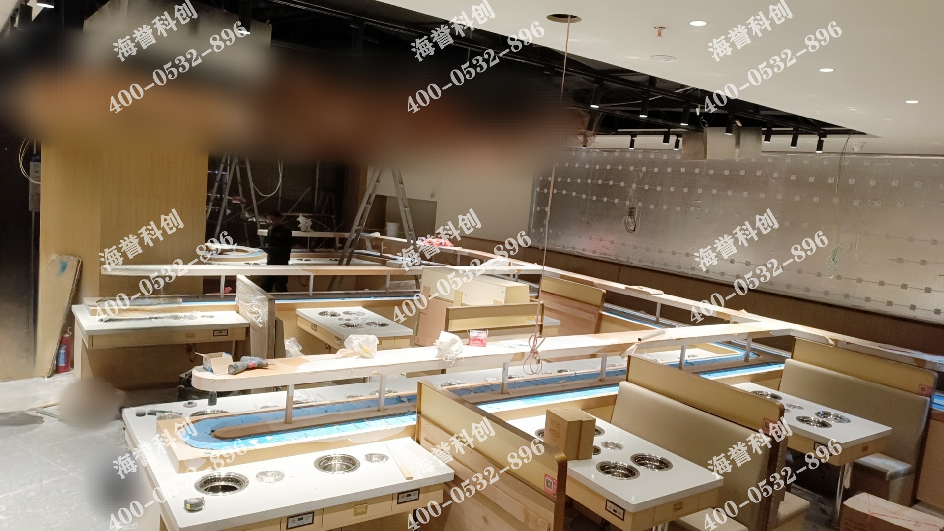 大型店面的一次安裝示例,專業(yè)設計師根據(jù)店面平面圖打造回轉線走向,避開店內(nèi)柱體等障礙物,在符合餐廳動線原理的基礎上預留合適的走動空間,配置數(shù)量足夠的餐位,海譽科創(chuàng)可非標定制各種形狀。旋轉小火鍋以單人餐位為主,可同時安裝雙人餐位或四人餐位,同時接待單人就餐和多人聚餐的顧客,提升本店競爭力。本套設備自帶排煙系統(tǒng),湯鍋口的排煙鋼圈能將小火鍋涮制過程中產(chǎn)生的油煙水汽即時帶走,店內(nèi)空氣清新,顧客就餐后身上不會有火鍋味殘留。常規(guī)回轉帶上方加裝中島,可用作餐具架或飲料架,方便顧客取用,提高店面空間利用率;中島適當?shù)母叨冗€能在一定程度上進行視線遮擋,打造更為舒適的就餐環(huán)境。整套設備外表光滑,利于后期清潔維護,進口電機提供核心動力,使用壽命長。