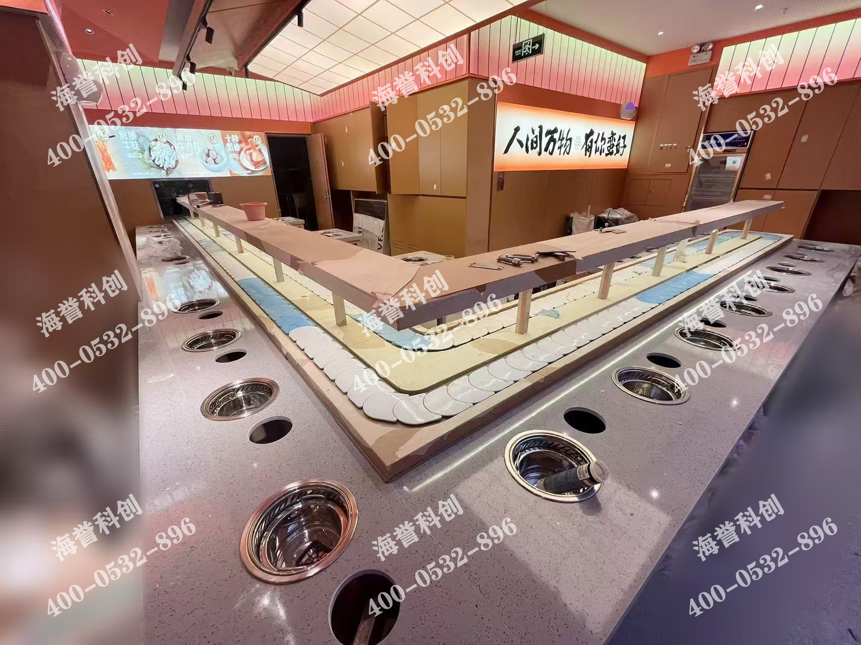 專業(yè)設(shè)計(jì)師根據(jù)店面平面圖設(shè)計(jì)回轉(zhuǎn)線走向,將回轉(zhuǎn)設(shè)備與后廚開辟的出餐口相連接,工作人員可直接在后廚及時(shí)上菜、補(bǔ)充菜品?;剞D(zhuǎn)線的設(shè)計(jì)需符合餐廳基本動(dòng)線原理,同時(shí)預(yù)留合適的走動(dòng)空間,保證動(dòng)線舒適,配置數(shù)量足夠的餐位,充分利用店面空間,海譽(yù)科創(chuàng)可非標(biāo)定制各種形狀。旋轉(zhuǎn)小火鍋以單人餐位為主,可安裝四人餐位,方便同時(shí)接待單人就餐和多人聚餐的顧客。店內(nèi)燈光跟隨回轉(zhuǎn)線的位置而布置,回轉(zhuǎn)設(shè)備的臺(tái)面、柜體、葉片所用材質(zhì)、顏色均可自由選擇,能打造出不同的外觀,以便靈活契合多種不同的店面裝潢風(fēng)格,同時(shí)有助于強(qiáng)調(diào)品牌形象。常規(guī)回轉(zhuǎn)帶上方加裝中島,可用作餐具架或飲料架,方便顧客取用,中島適當(dāng)?shù)母叨冗€能提供一定程度的視覺遮擋,打造更具舒適性的就餐環(huán)境。本套設(shè)備自帶排煙裝置,湯鍋口的排煙鋼圈能將小火鍋涮制過程中產(chǎn)生的油煙水汽即時(shí)帶走,顧客就餐后身上不會(huì)有火鍋味殘留,店內(nèi)空氣清新,輕松打造新型時(shí)尚旋轉(zhuǎn)小火鍋店。整套回轉(zhuǎn)設(shè)備外觀光潔,所用材質(zhì)堅(jiān)韌耐用,易于后期清潔維護(hù),進(jìn)口電機(jī)提供核心動(dòng)力,使用壽命長。