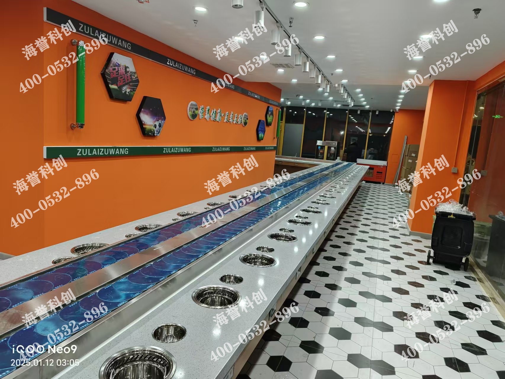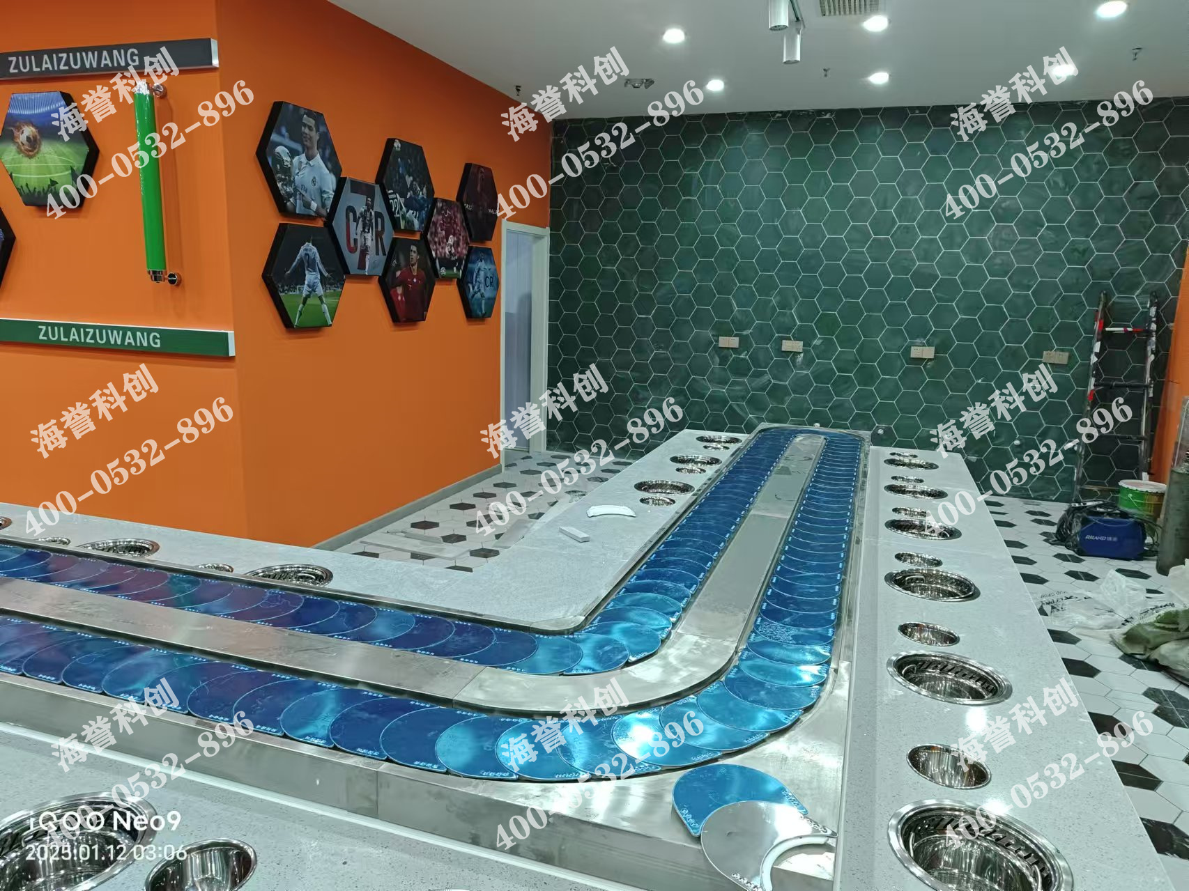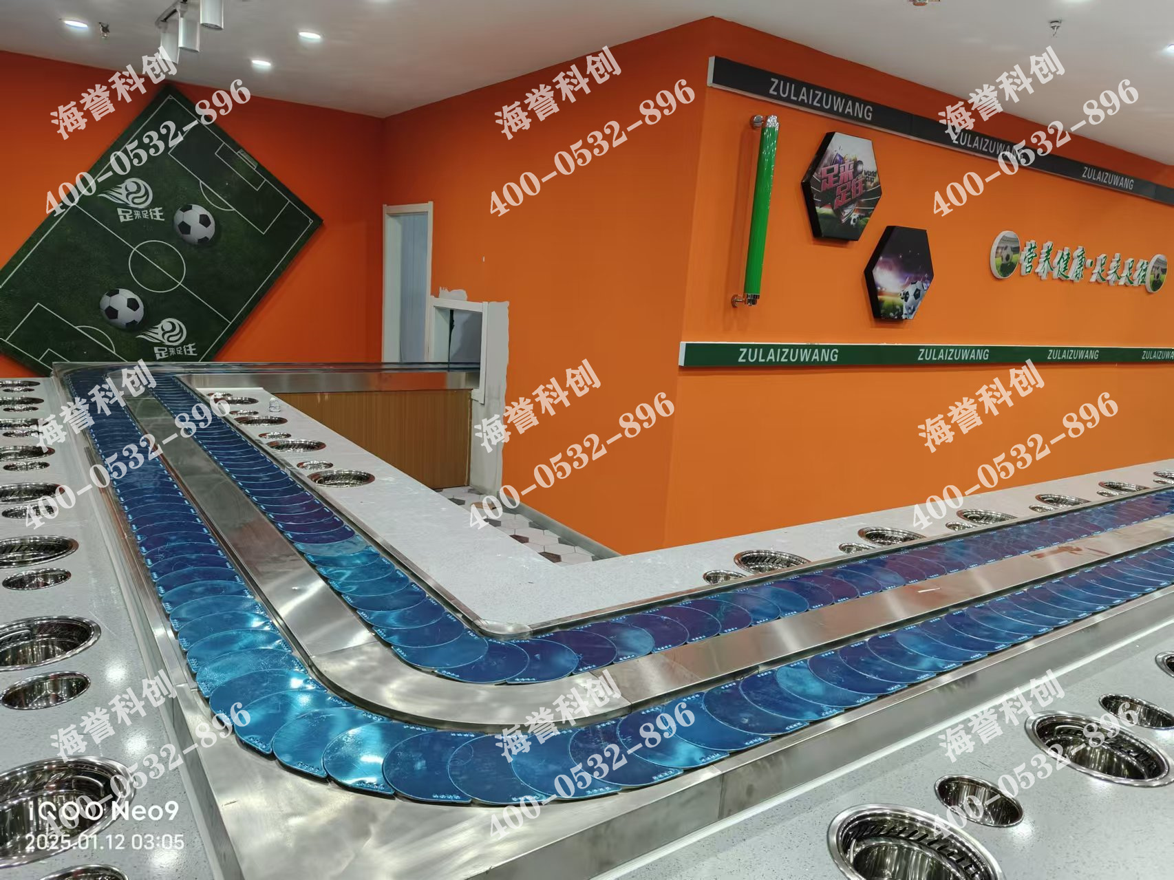 專業(yè)設(shè)計(jì)師根據(jù)店面平面圖設(shè)計(jì)回轉(zhuǎn)線走向,回轉(zhuǎn)設(shè)備整體呈U型,圍繞店內(nèi)后廚,將其一端與后廚開辟的出餐口相連接,工作人員可直接在后廚及時(shí)上菜、補(bǔ)充菜品。本店的裝潢風(fēng)格特殊,帶有體育元素,而回轉(zhuǎn)設(shè)備的臺面、柜體、葉片等所使用的顏色、材質(zhì)均可自由選擇的個(gè)性化定制方式完全可以適應(yīng)多種不同的視覺設(shè)計(jì)。本套設(shè)備自帶排煙裝置,湯鍋口的排煙鋼圈能即時(shí)將小火鍋涮制過程中產(chǎn)生的油煙水汽帶走,顧客就餐后身上不會有火鍋味殘留,店內(nèi)空氣清新?;剞D(zhuǎn)帶葉片采用海譽(yù)科創(chuàng)專利產(chǎn)品四星譽(yù)金鋼,外觀采用防滑式設(shè)計(jì),較大的寬度適配大號餐盤,能穩(wěn)妥地承托其在回轉(zhuǎn)帶上平穩(wěn)運(yùn)行。整套設(shè)備外表光滑,利于后期清潔維護(hù),進(jìn)口電機(jī)提供核心動(dòng)力,使用壽命長。