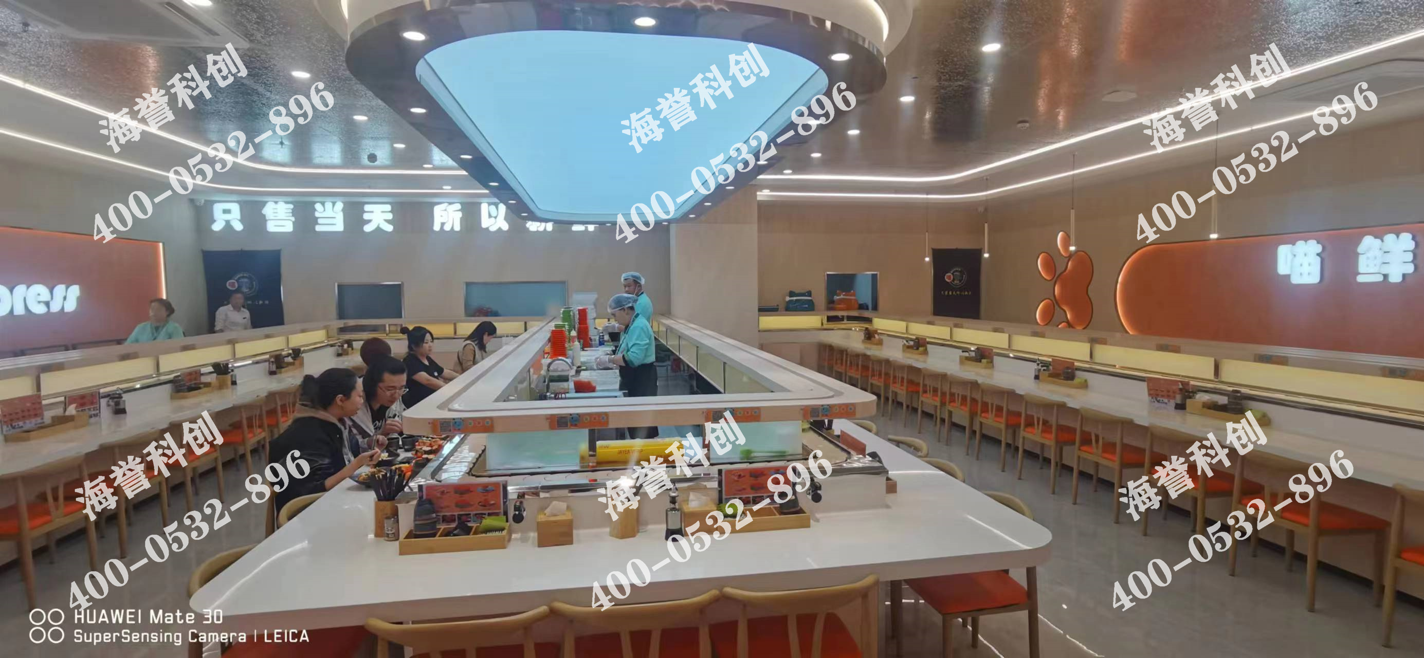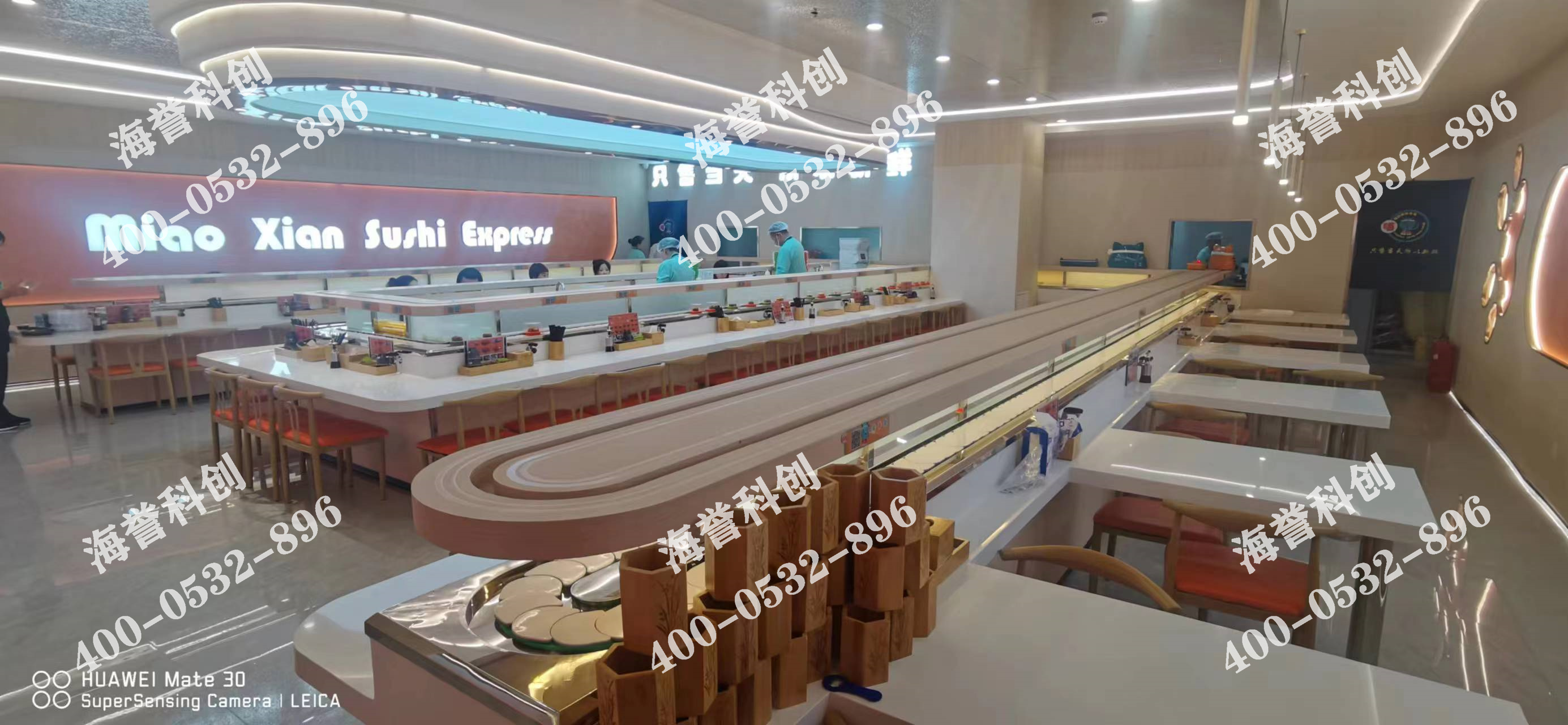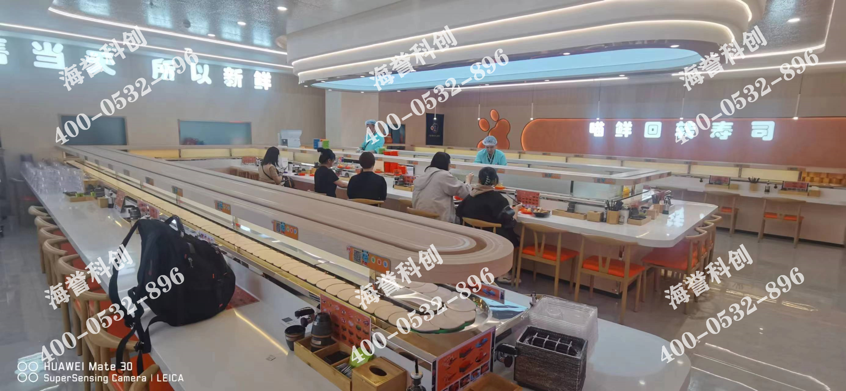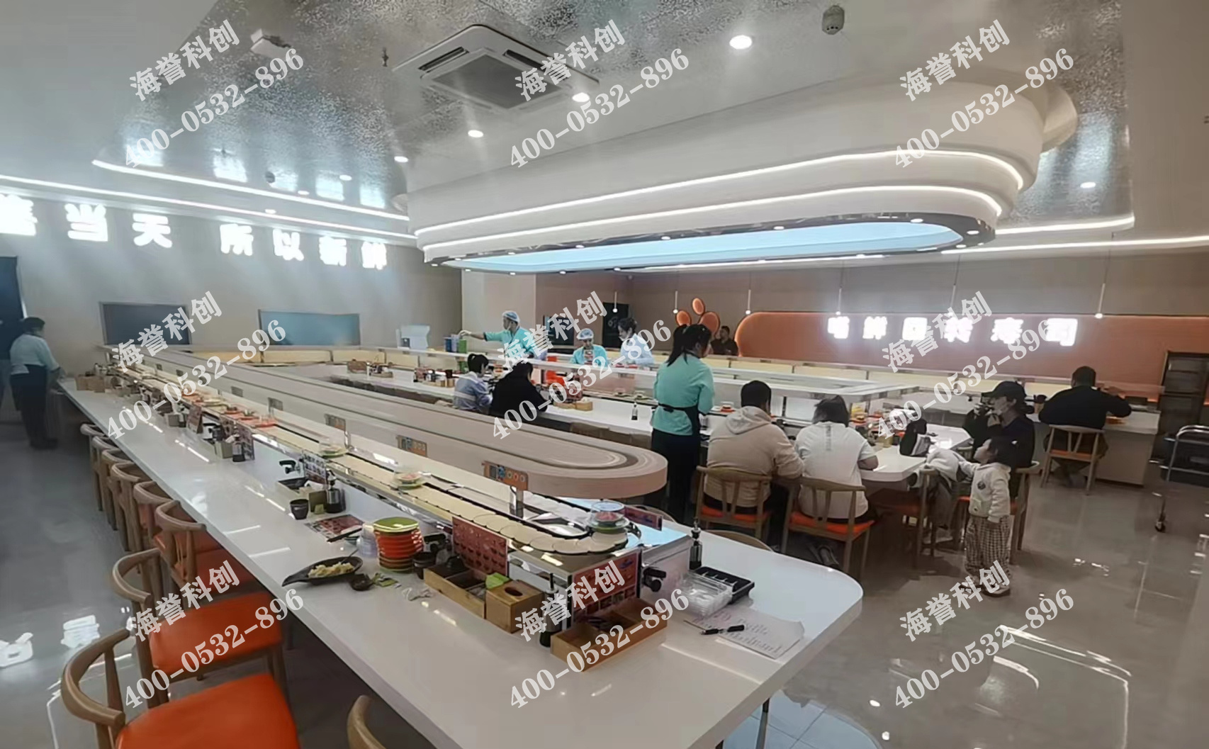 海譽(yù)科創(chuàng)吉林長(zhǎng)春回轉(zhuǎn)壽司設(shè)備搭載智能送餐小火車安裝完成。