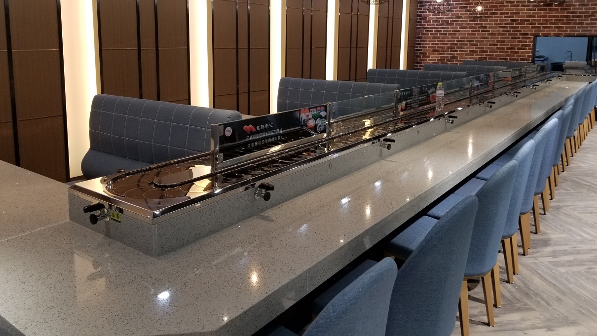 旋轉(zhuǎn)小火鍋設(shè)備與回轉(zhuǎn)壽司設(shè)備有相通的地方,即其本質(zhì)都是將菜品放上回轉(zhuǎn)線,自動(dòng)傳輸至顧客面前的智能回轉(zhuǎn)設(shè)備。需要注意的是,旋轉(zhuǎn)小火鍋和回轉(zhuǎn)壽司分屬于兩種餐飲品類,從細(xì)節(jié)上來講兩者之間的就餐模式是有所不同的。回轉(zhuǎn)壽司餐廳脫胎于日式傳統(tǒng)壽司餐廳,依舊很注重壽司師傅現(xiàn)場捏制壽司的可視化,因此回轉(zhuǎn)壽司設(shè)備的設(shè)計(jì)還另有亮點(diǎn)。
