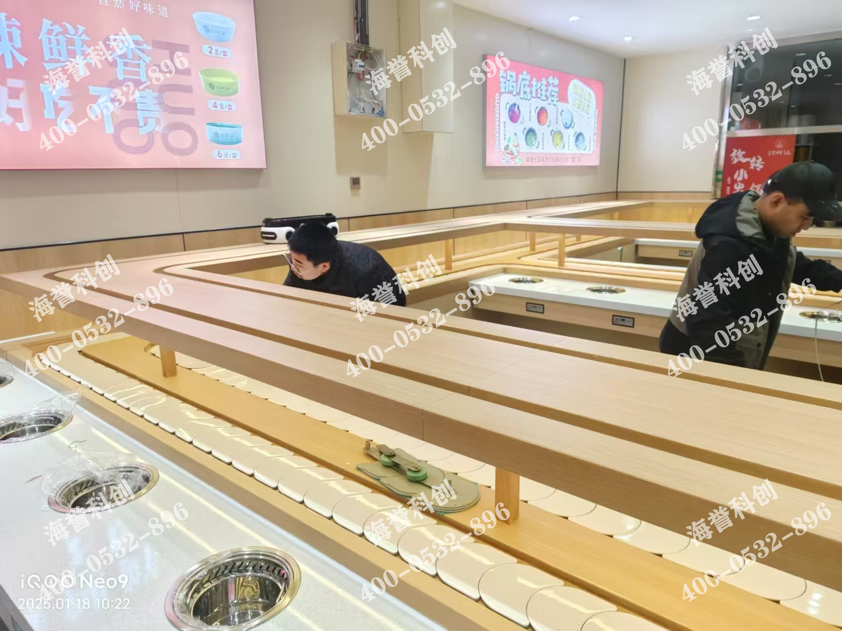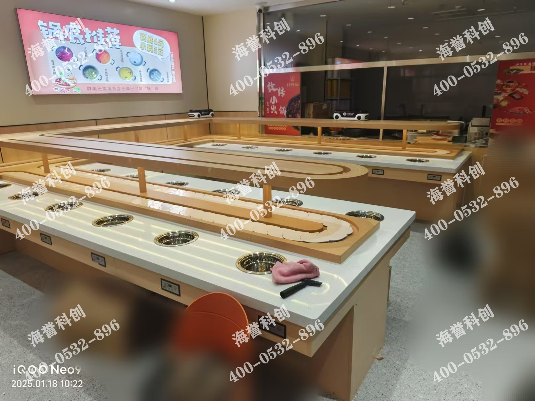 海譽科創(chuàng)河北單涮無煙小火鍋配置智能送餐小火車安裝完成。