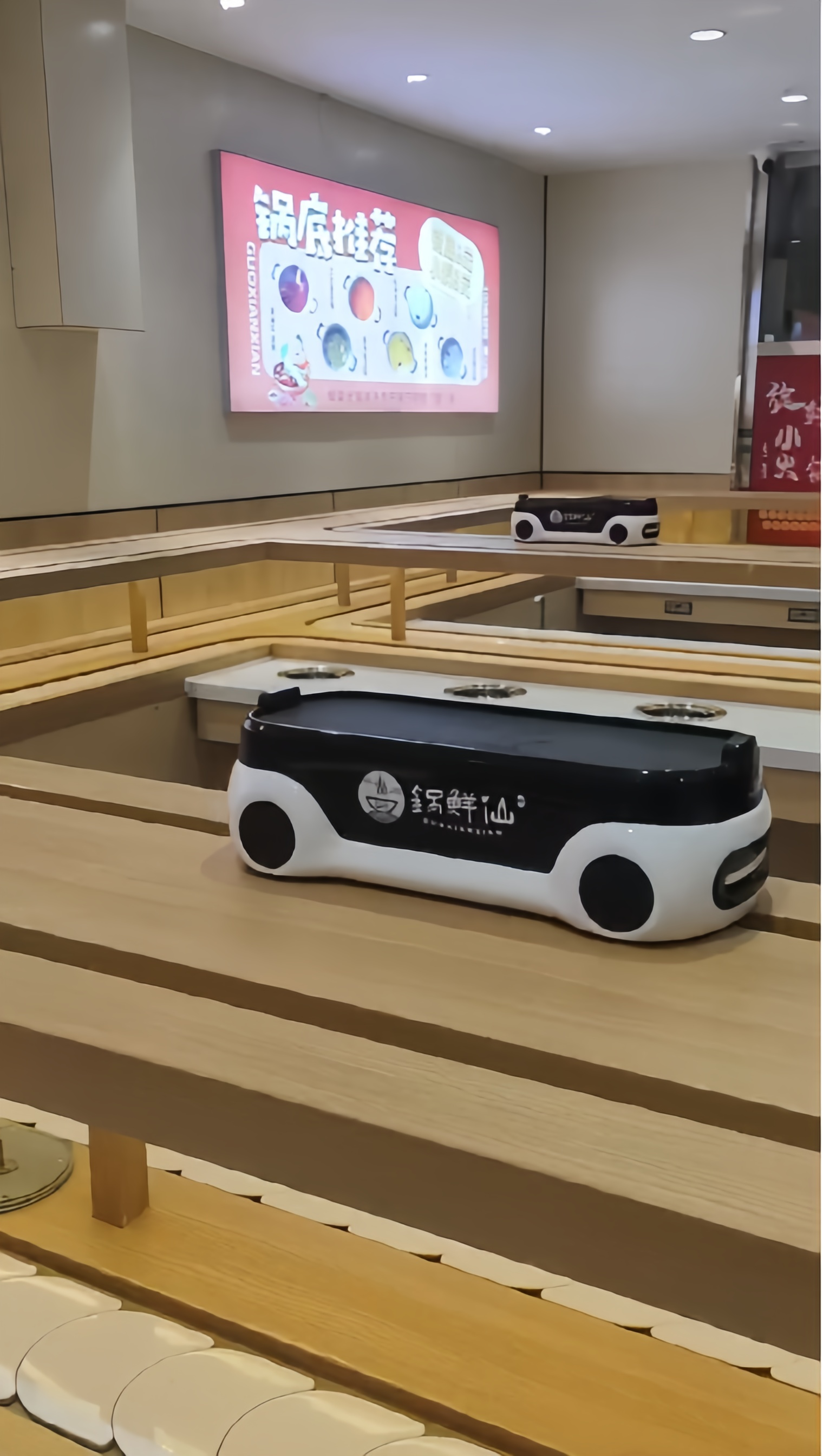 E型設(shè)備,適用于寬敞規(guī)整的店面,兩輛智能送餐小火車并行,與點餐系統(tǒng)配套安裝,使整個上菜過程更為安全高效,一輛送餐小火車可至少抵用兩個人力。整套設(shè)備外表光潔,利于后期清潔維護,白色葉片簡潔大方,原木色送餐車軌道與下方的回轉(zhuǎn)主體保持一致,相得益彰。送餐軌道下方鋪設(shè)燈帶,能耗低,使用方便,能即時為回轉(zhuǎn)帶上的各種新鮮菜品進行補光,維持其應(yīng)有的賣相,吸引顧客。配備排煙裝置,湯鍋口的排煙鋼圈能將小火鍋涮制過程中產(chǎn)生的油煙水汽即時帶走,店內(nèi)空氣清新,輕松打造新型時尚旋轉(zhuǎn)小火鍋店。送餐小火車的外形有多種選擇,同時支持來圖定制,播報語音同理;小火車一次可運送多份菜品,一鍵定點直達,覆蓋所有餐位,轉(zhuǎn)彎直行無壓力,送餐結(jié)束后會自動返回后廚,打造高效率智能化新型旋轉(zhuǎn)小火鍋店。